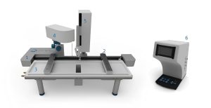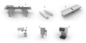 1. Frame – Khung; 2. Barriers – Thanh barrier; 3. Trough top – Nắp máng; 4. Surface pressure sensor – Cảm biến áp suất bề mặt; 5. Dipping mechanism (LB option) – Cơ chế nhúng (tùy chọn LB); 6. Interface unit – Bộ giao diện