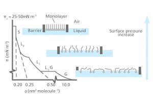 Các thanh barrier điều khiển bằng phần mềm tại giao diện thực hiện quá trình nén lớp đơn phân tử cho đến khi cảm biến áp suất bề mặt xác định đạt đến mật độ nén tối đa. Lớp đơn phân tử bị nén có thể được coi là một chất rắn hai chiều, với tỷ lệ diện tích bề mặt trên thể tích lớn hơn đáng kể so với vật liệu khối. Thí nghiệm sử dụng máng Langmuir cho phép nghiên cứu và phân tích cách các phân tử sắp xếp trong môi trường hai chiều. Bên cạnh đó, đường cong đẳng nhiệt áp suất bề mặt – diện tích cung cấp thông tin quan trọng về diện tích trung bình của từng phân tử cũng như độ nén của lớp đơn phân tử.